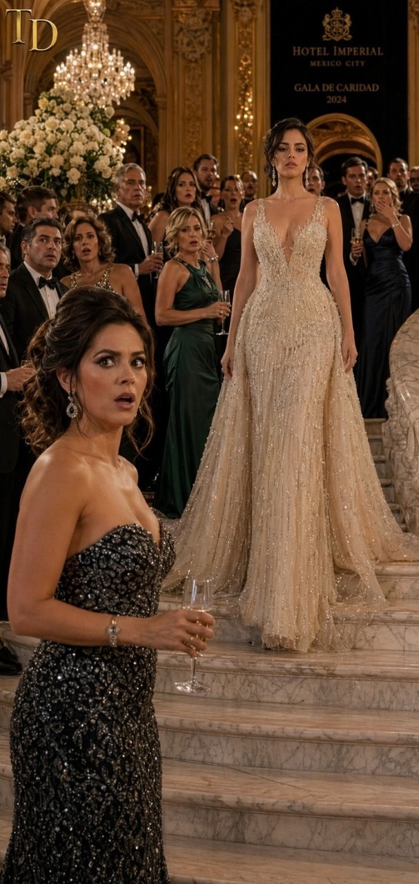 Os lustres de cristal do Hotel Imperial brilhavam sobre o vestido marfim, dando-lhe vida. Cada cristal costurado à mão refletia a luz como se contivesse fogo em seu interior.