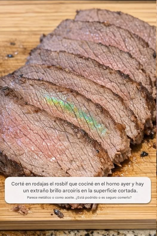 En la mayoría de los casos, ver un brillo iridiscente en el rosbif es completamente normal y seguro. Este efecto es más notorio en fiambres o sobras finamente cortados, ya que la luz penetra y se refracta con mayor facilidad. Es común en el rosbif, el pavo e incluso el jamón.