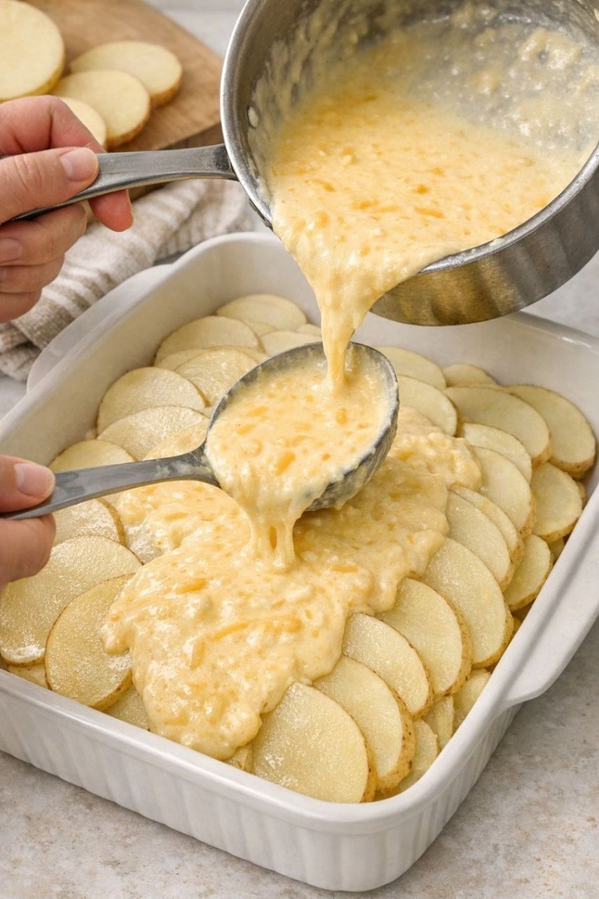 Este é o tipo de batata gratinada que parece um jantar de domingo, mas é tão fácil de preparar quanto em uma noite de semana. Começa da maneira tradicional do Meio-Oeste americano: batatas cruas fatiadas finamente em uma assadeira de cerâmica, depois basta despejar uma mistura quente e cremosa de queijo por cima e deixar o forno fazer o resto. Minha mãe fazia uma versão disso para os jantares da igreja e feriados na fazenda, e as pessoas sempre achavam que ela tinha passado horas cozinhando. Na verdade, é só creme de leite fresco, manteiga derretida, um pouco de farinha, sal e uma boa quantidade de queijo cheddar ralado, transformados em um molho aveludado que penetra nas batatas enquanto assam, resultando naquele acompanhamento clássico, dourado e borbulhante que todo mundo escolhe primeiro.