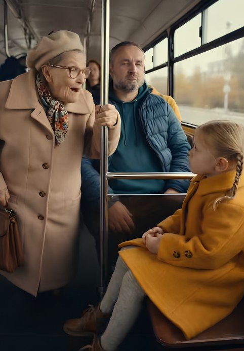 La anciana echó un vistazo a su alrededor. Su mirada recorrió las filas y se detuvo en una niña pequeña, de unos cinco años, sentada en el borde del banco junto a su madre. La niña llevaba un abrigo amarillo brillante y miraba fijamente a la calle. La abuela se inclinó ligeramente hacia ella y le preguntó con voz tranquila: «Pequeña, ¿me cedes el asiento?».