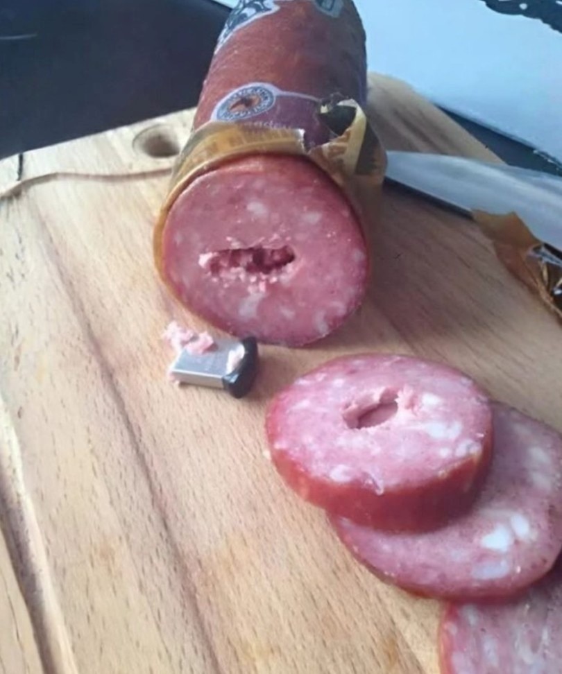 Corté la salchicha con cuidado y vi un destello plateado. Creí que era un trozo de papel de aluminio. Pero cuando saqué el objeto, un escalofrío me recorrió. En mi mano tenía… una memoria USB cubierta de restos de carne y grasa.