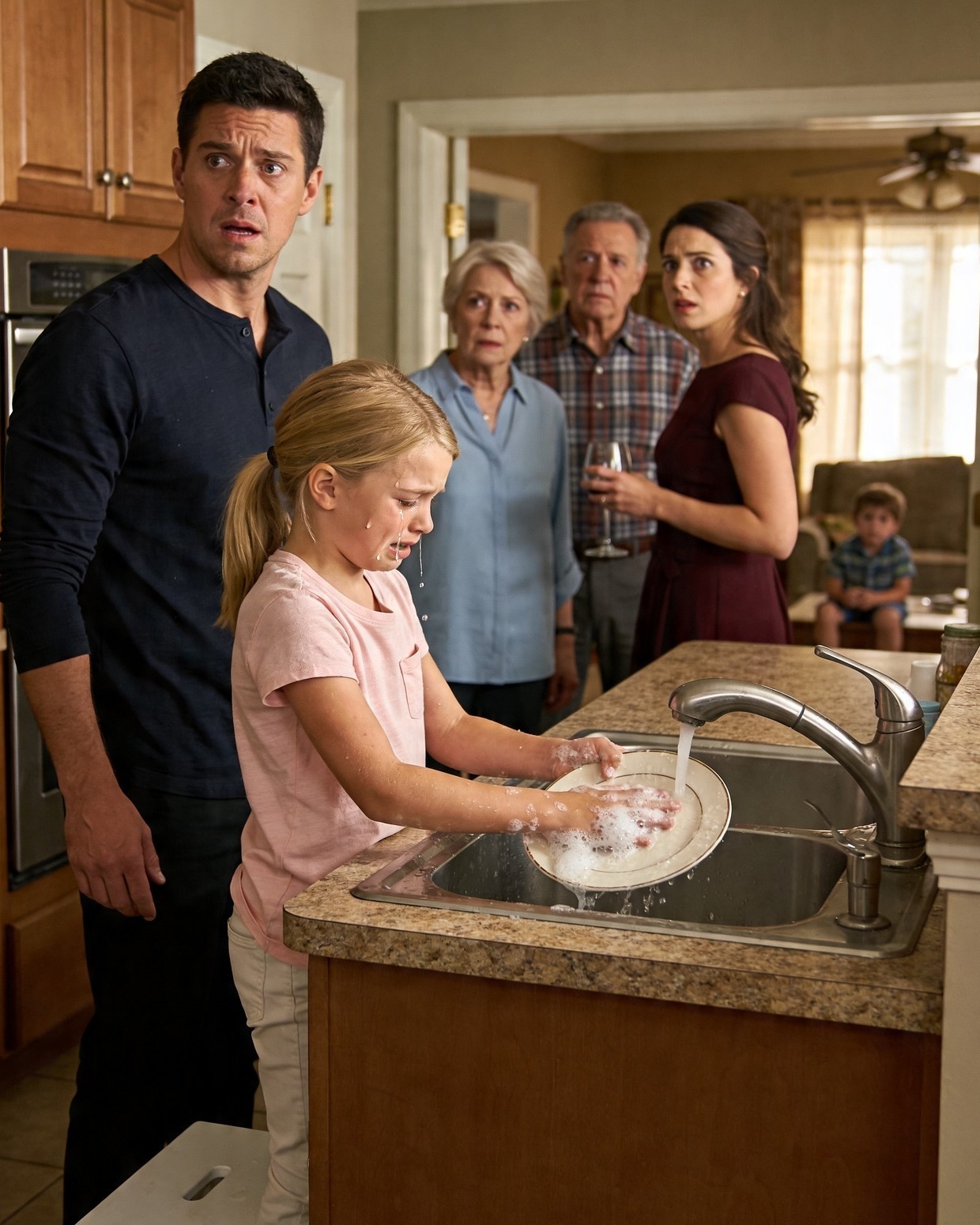 La noche que entré en casa de mis padres y encontré a mi hija de seis años subida a un taburete lavando los platos mientras las hijas de mi hermana se reían sentadas en el salón, no grité.