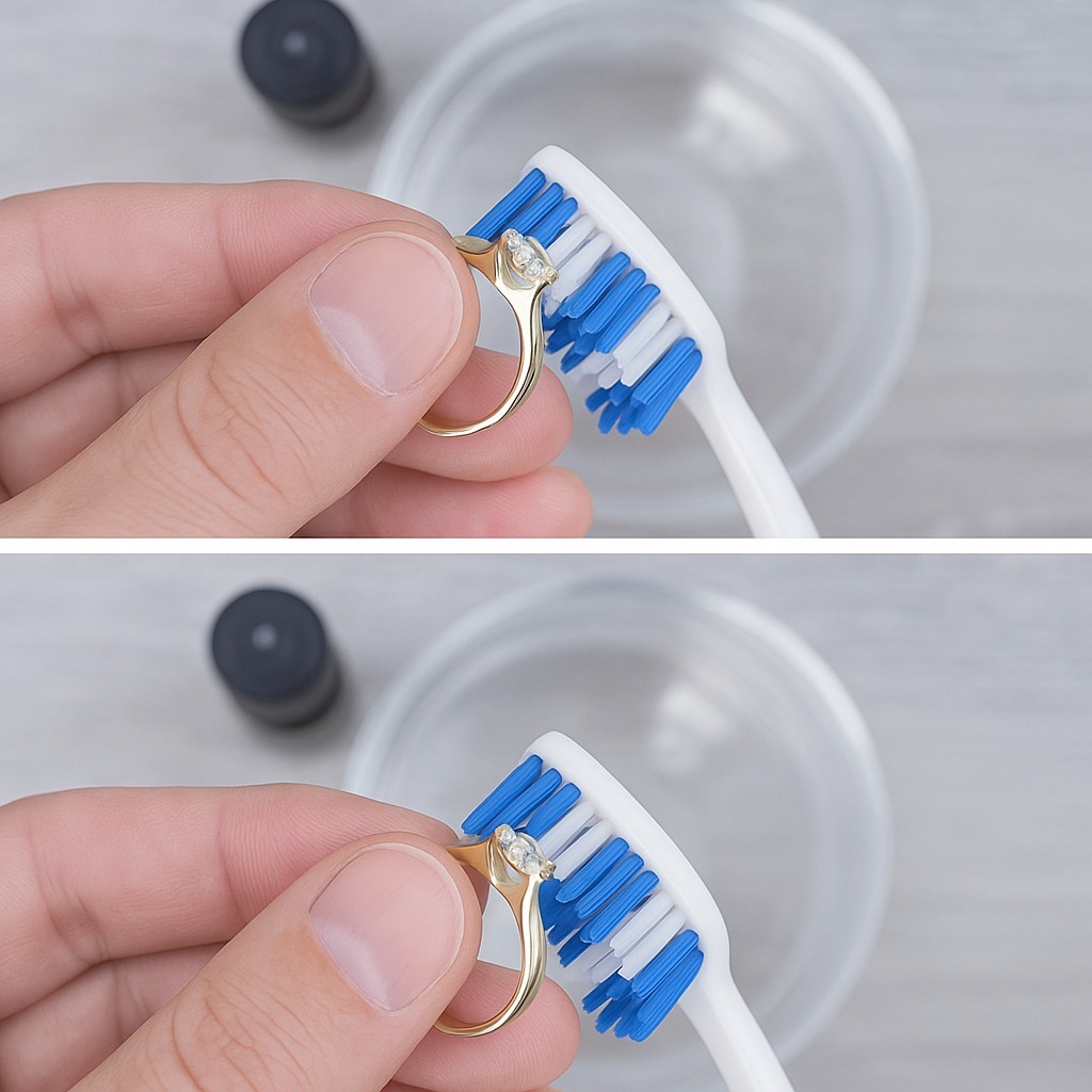Mezcla el agua con el aceite esencial en un bol. Usa el cepillo para agitar la mezcla y luego frota suavemente el diamante. Déjalo reposar en el bol durante 10 a 15 minutos. Enjuágalo con agua limpia y, si es necesario, repite la limpieza. Finalmente, deja secar al aire libre.