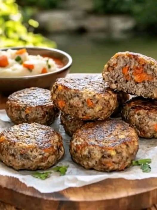 Ingredientes: Hamburguesas de carne australiana doradas, salteadas con hierbas y salsa de tomate