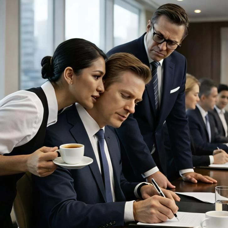 Plötzlich näherte sich einer der Reinigungskräfte unter der Vorwand, Kaffee zu Bringen. Er beugte sich leicht zum Ohr des Geschäftsführers und flüsterte mit vor Angst zitternder Stimme Worte, die ihm das Blut in den Adern gefrieren ließen: