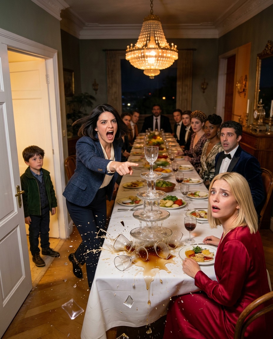 Glass shattered across the floor. Champagne spilled everywhere. The room froze.