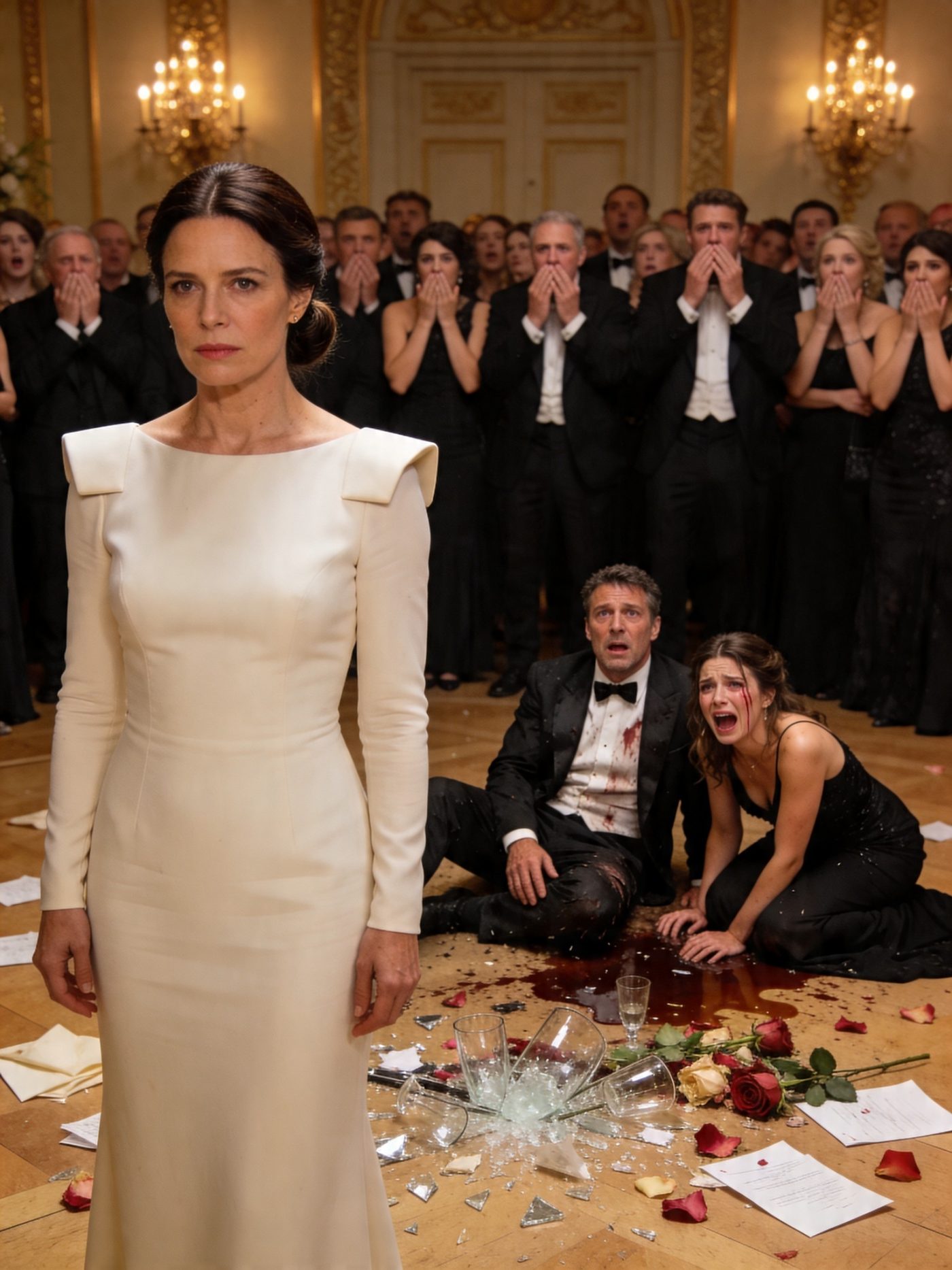 Julian voltou e se gabou de sua conversa com o CEO, o que levou Cynthia a erguer sua taça em um brinde irônico. Com um gesto preciso e deliberado, ela deu um estalo com o pulso, espirrando um pouco de vinho tinto escuro no meu corpete de seda branca.