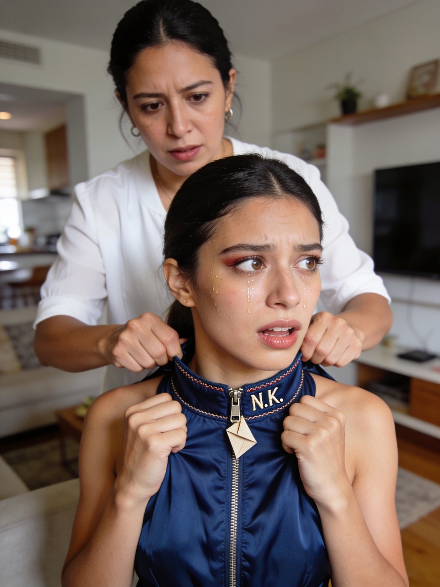 Al principio pensé que el cierre se había atorado. Corrí hacia ella para ayudarla, pero Natalia retrocedió bruscamente y golpeó la mesa lateral. Su voz ya no era de incomodidad, era puro pánico.