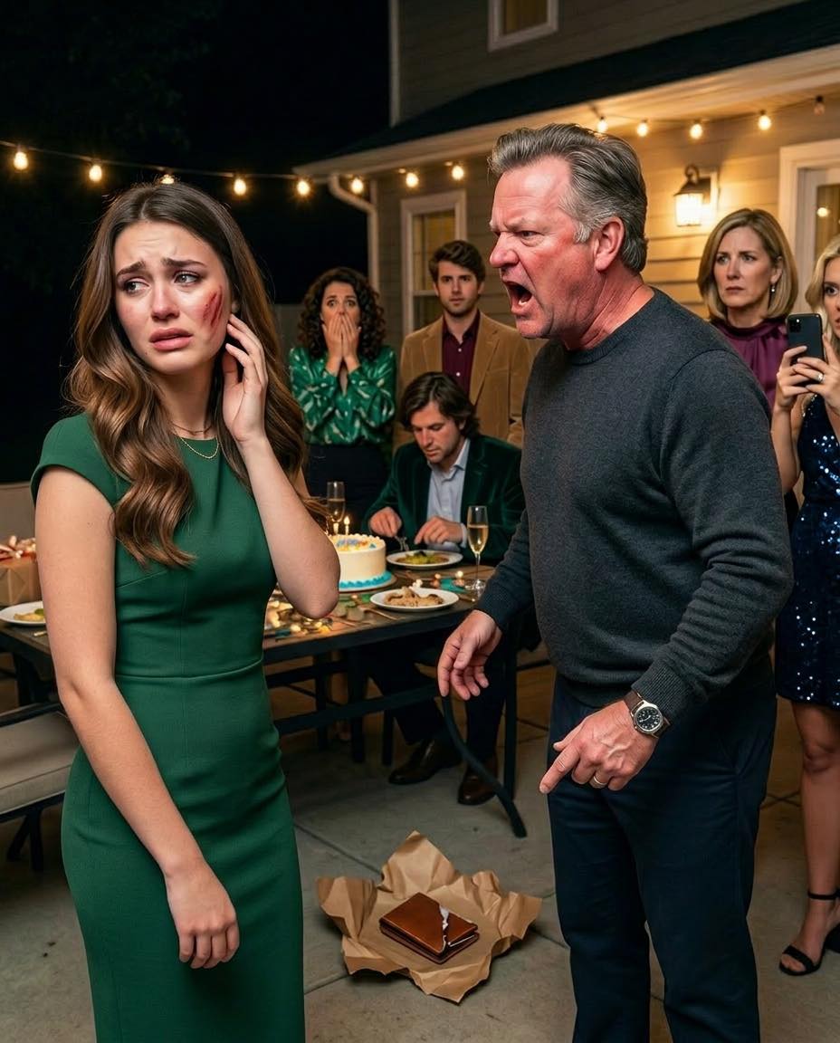 El estruendo resonó con tanta fuerza en el patio que todas las conversaciones se detuvieron al instante. Un segundo antes estaba allí de pie con el paquete de papel kraft aún medio abierto en su mano, y al siguiente sintió la cara ardiendo, la cabeza ladeada y una copa de champán se me había resbalado de las manos y se había estrellado contra las lasas cerca de mis zapatos.