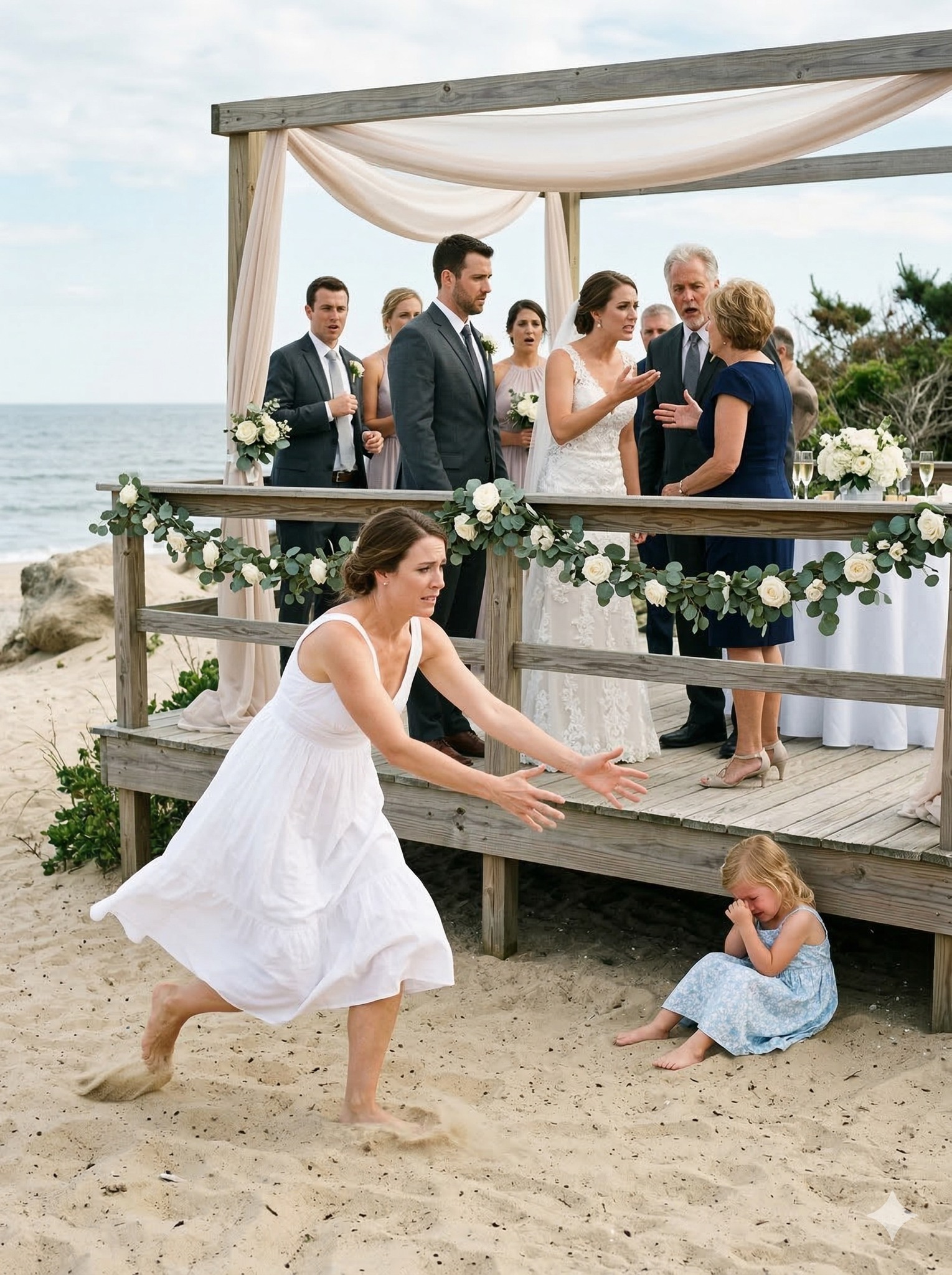 A mi lado, mi hija me sostenía la manita con fuerza. Wren tenía ocho años y una expresión seria, dulce y demasiado observadora para una niña que aún guardaba conchas pulidas en una bolsita con cremallera en forma de zorro. Llevaba un vestido rojo brillante para la ceremonia y sandalias blancas que intentaba con todas sus fuerzas no rayar en el camino de piedra.
