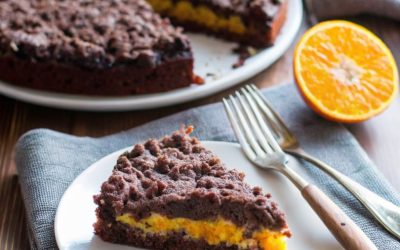 Bolo de laranja com crumble e um recheio macio de chocolate amargo.