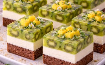 Pastel con kiwi, tarta de queso de vainilla y gelatina.