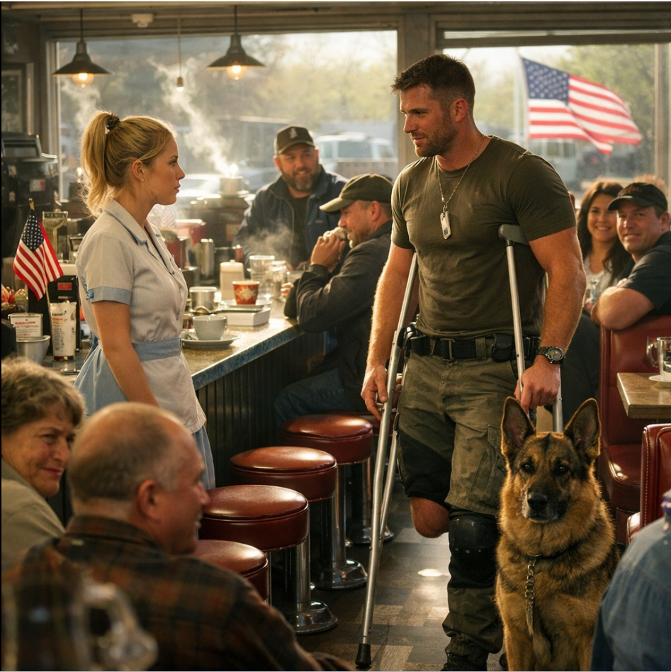 El timbre sonó alrededor de las 8:30, pero al principio nadie le prestó atención. La puerta del restaurante se abrió docenas de veces durante la hora punta de la mañana. Otro cliente significaba otro pedido de huevos, otra taza de café, otra voz que se unía al bullicio ambiental. Pero algo en esa entrada cambió gradualmente la atmósfera del restaurante. Las conversaciones no cesaron por completo. Simplemente se suavizaron. Algunas cabezas se giraron hacia la puerta, luego más. El hombre que estaba allí parecía haber pasado mucho tiempo al aire libre. Su rostro estaba curtido, su chaqueta oscura desgastada pero limpia. Una mano sujetaba una muleta metálica que lo sostenía, la otra descansaba sobre el arnés de un gran pastor alemán que permanecía tranquilamente a su lado. El chaleco del perro tenía un pequeño parche que indicaba que era un perro de servicio militar. Pero lo que la mayoría de la gente notó primero no fue el perro. Fue la pernera del pantalón cuidadosamente doblada, metida justo por encima de la rodilla del hombre.