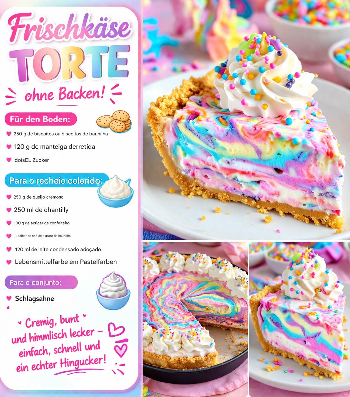 A combinação de uma base crocante de biscoito com um recheio leve e aerado de cream cheese e chantilly cria uma textura maravilhosamente cremosa. Os redemoinhos coloridos lembram ovos de Páscoa e fazem deste bolo um verdadeiro destaque em qualquer mesa de Páscoa. As crianças adoram as cores alegres, enquanto os adultos apreciam o sabor suave e cremoso.
