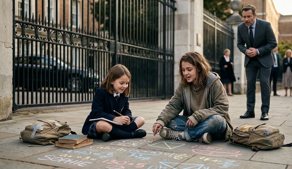 Sophie sostenía un cuaderno en su regazo y escuchaba atentamente mientras la chica dibujaba números y figuras en la acera con un palito. Con entusiasmo, explicaba algo, señalando las marcas como si resolviera un rompecabezas.
