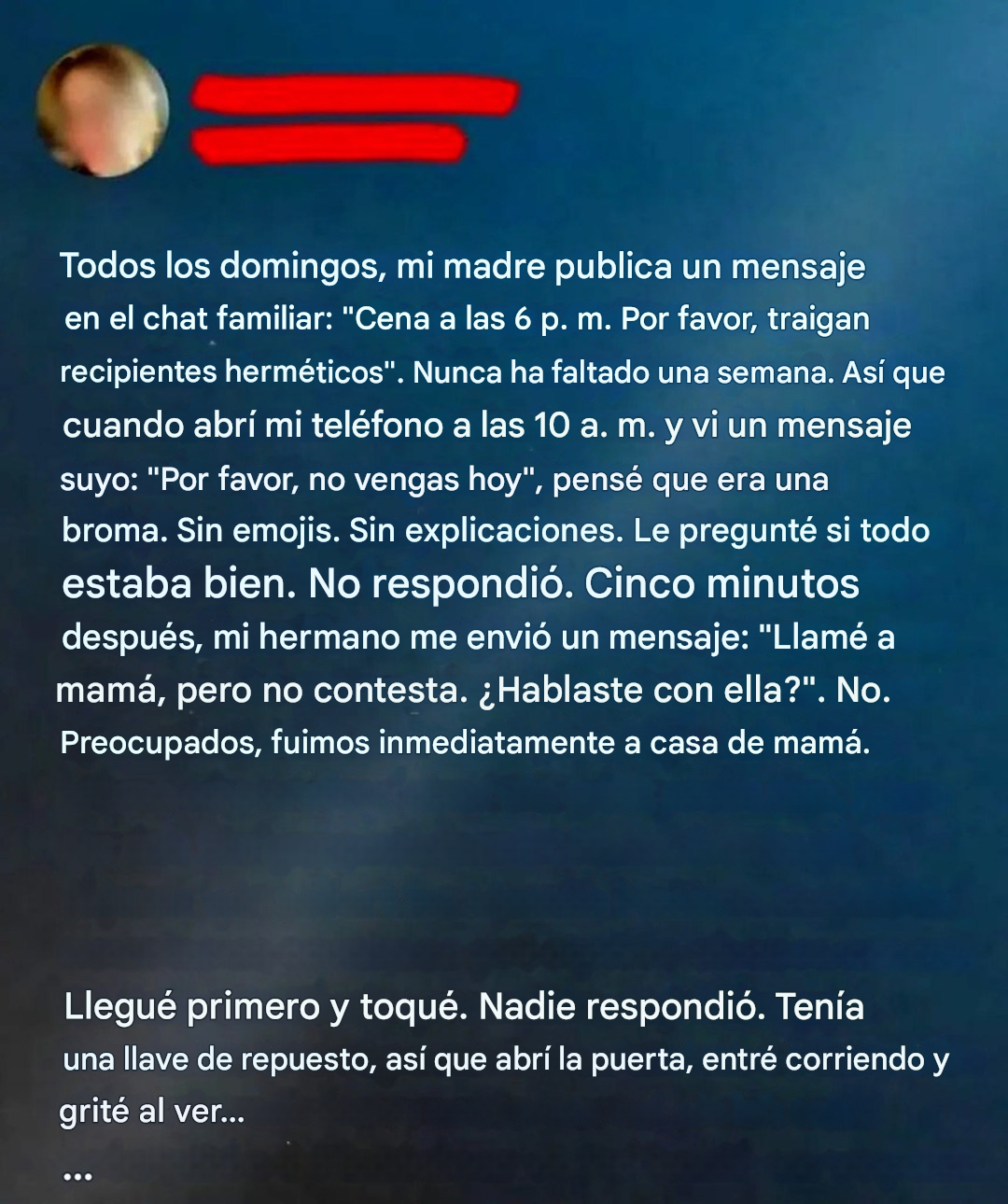 Antes de irse a dormir, mamá envió otro mensaje al chat familiar: "Cena el próximo domingo a las 6 p. m. Traigan recipientes. Y quizás un abrazo".