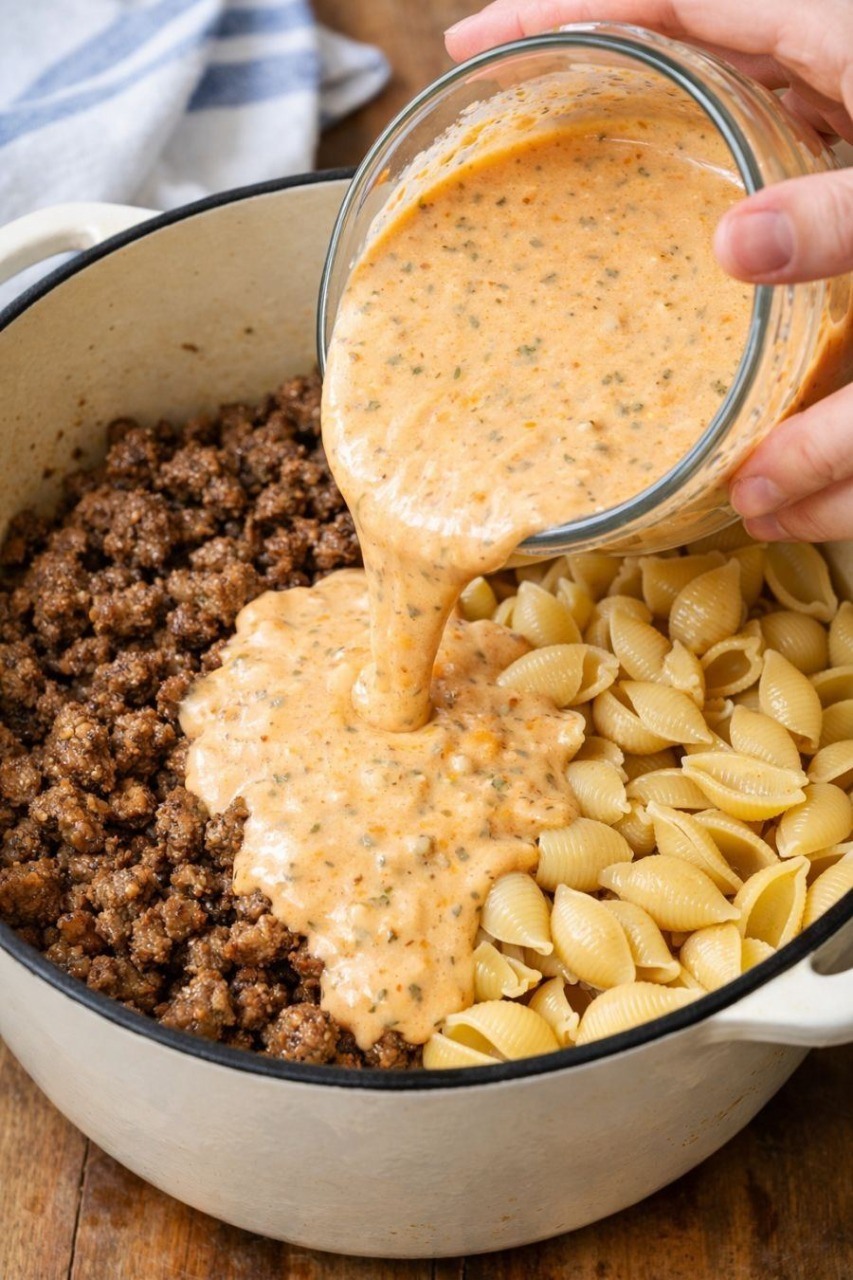 Este cremoso estofado de carne y pasta es una de esas cenas de una sola olla que parecen demasiado fáciles para lo reconfortante y sustancioso que es. Todo se prepara en una sartén de hierro fundido: se dora la carne molida, se esparce la pasta seca en forma de concha y luego se vierte una salsa cremosa con tomate y queso por encima, dejándolo hervir a fuego lento. La salsa es una simple mezcla de caldo de res, crema espesa, pasta de tomate, condimento italiano y queso cheddar rallado, lo que da como resultado un sabor que recuerda a una acogedora mezcla de fideos instantáneos y lasaña en sartén. Empecé a preparar este plato las noches que llegaba tarde del trabajo, pero aún quería algo casero que nos mantuviera saciados toda la noche, y rápidamente se convirtió en un básico de nuestro menú semanal.