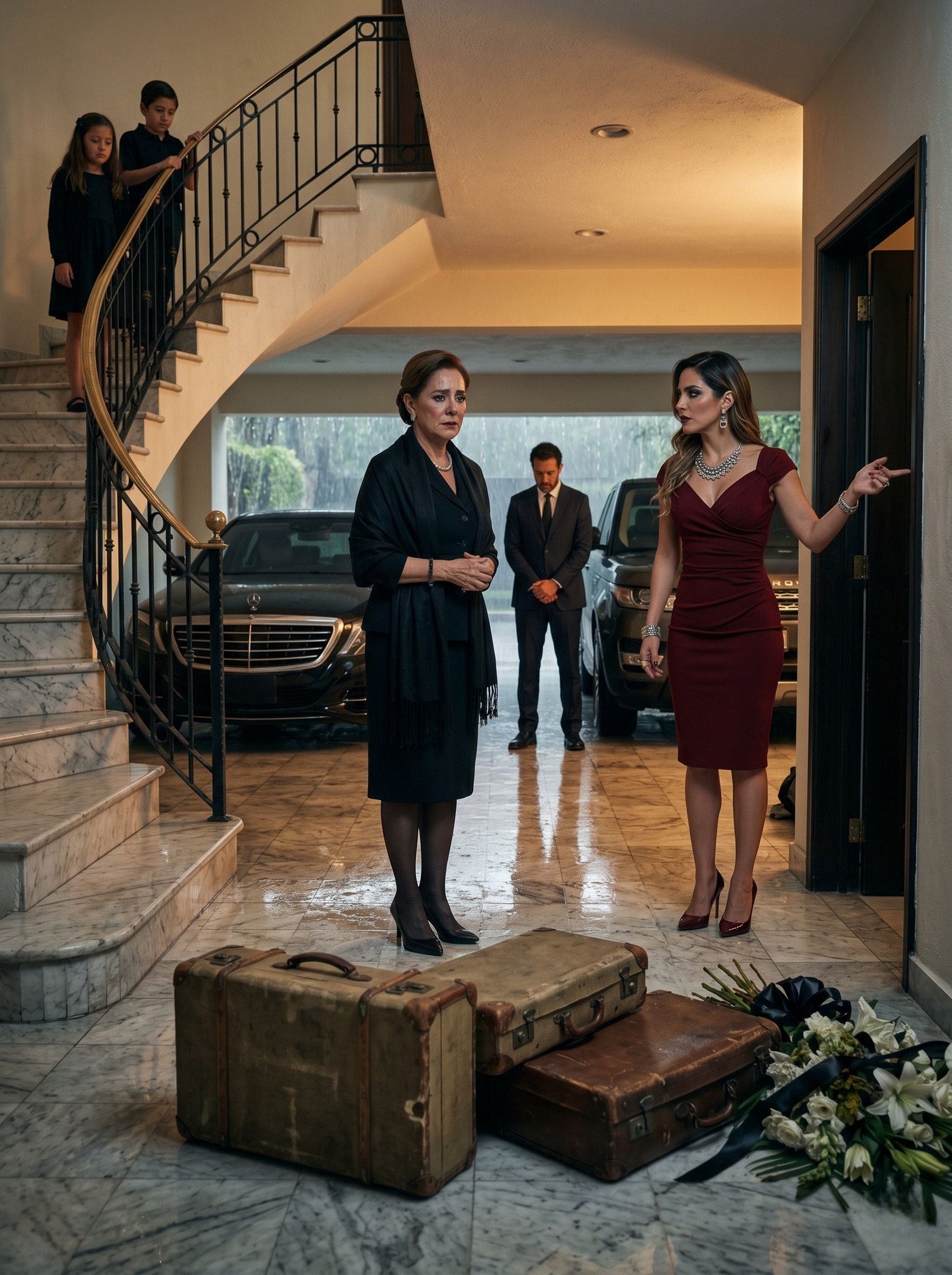 Ni siquiera habían pasado dos horas desde que regresamos del cementerio cuando Patricia se plantó en medio del vestíbulo de la casa, con sus tacones todavía manchados por la lluvia del panteón, y señaló mis maletas apiladas junto al garaje como si fueran bolsas de basura. El olor a lirios del funeral seguía pegado a mi vestido negro. Yo todavía sentía en la palma el frío de la mano de Roberto antes de que cerraran el ataúd. Y aun así, aquella mujer tuvo el descaro de mirarme de arriba abajo, sonreír con la boca apretada y decir: